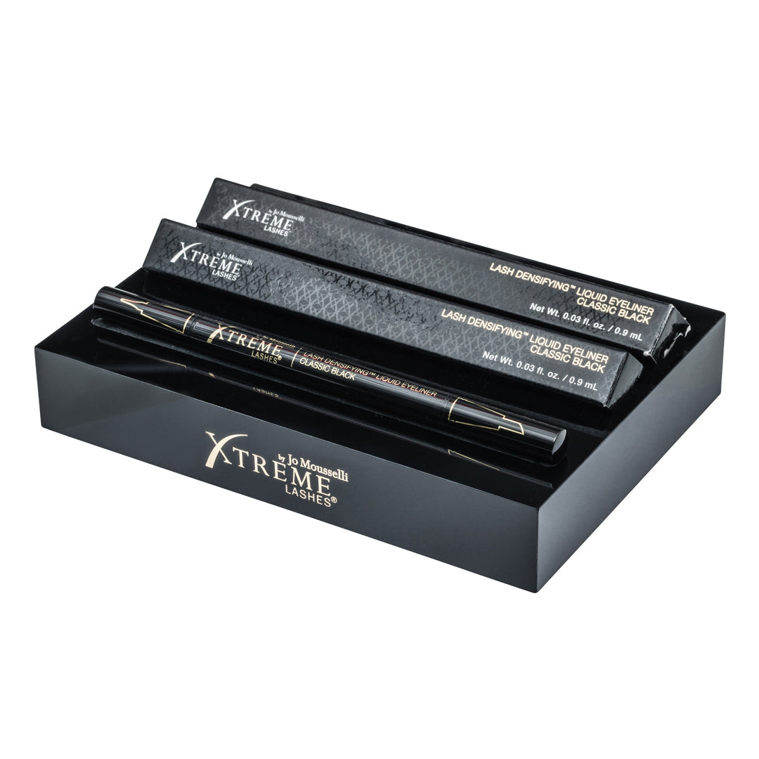 Intriguez les clients avec ce présentoir chic noir et or pour les aider à présenter et à vendre l'eye-liner liquide Lash Densifying™. Ce présentoir est complémentaire aux autres blocs présentoirs Xtreme Lashes, avec des emplacements pour un testeur et 2 unités de vente au détail disposées horizontalement pour empêcher les pointes de sécher.